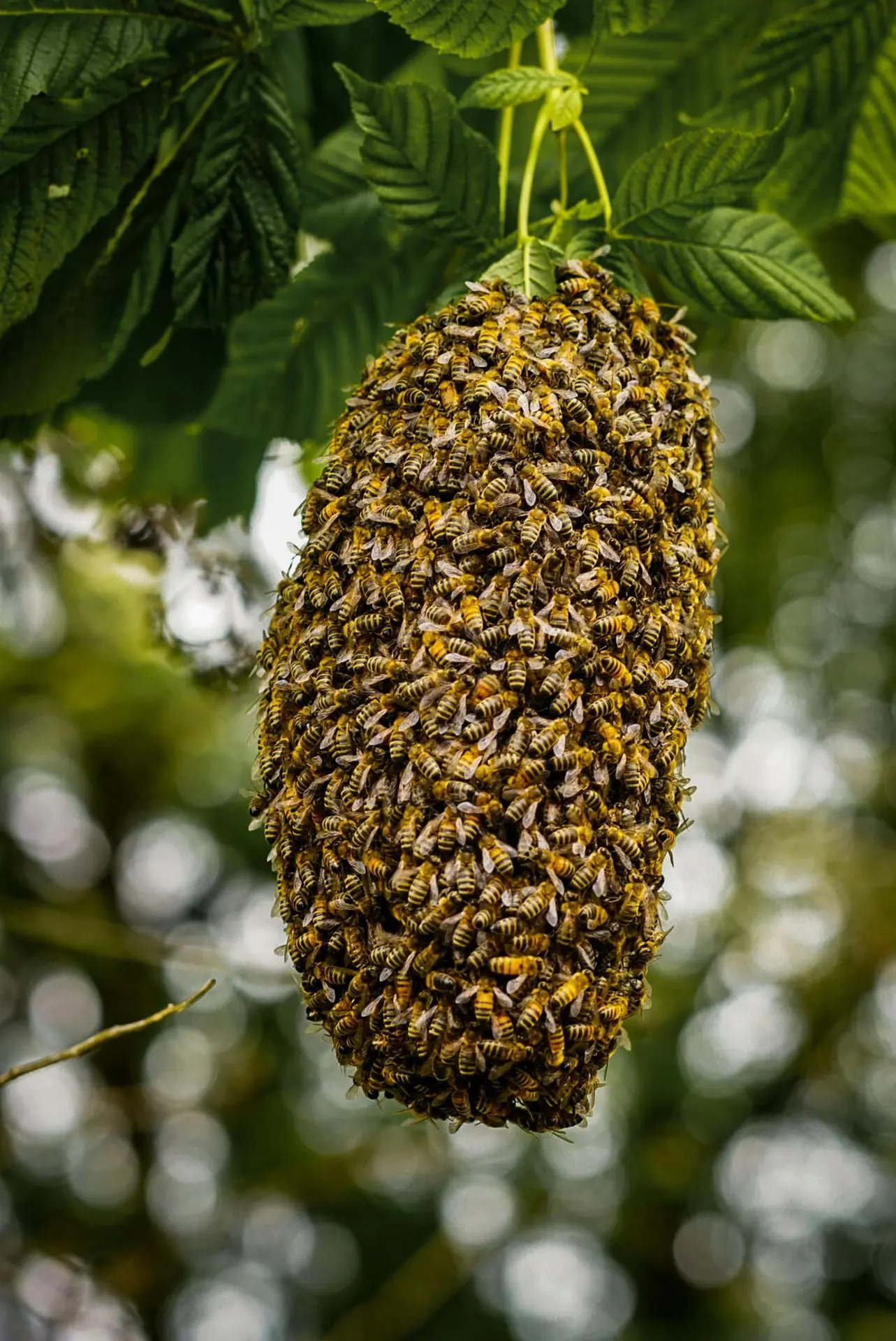 ✅ Un essaim d’abeilles est une grappe compacte d’abeilles suspendue sur une branche, un mur ou un autre support. Il est temporaire et se déplace généralement en quelques heures ou jours.